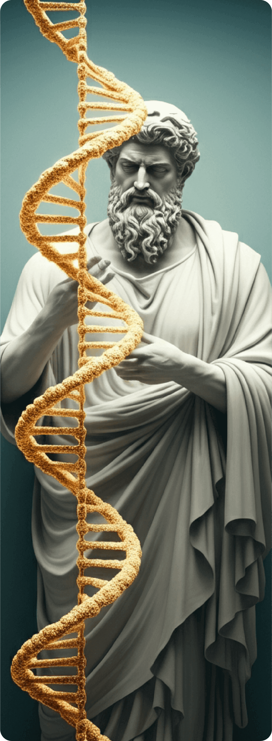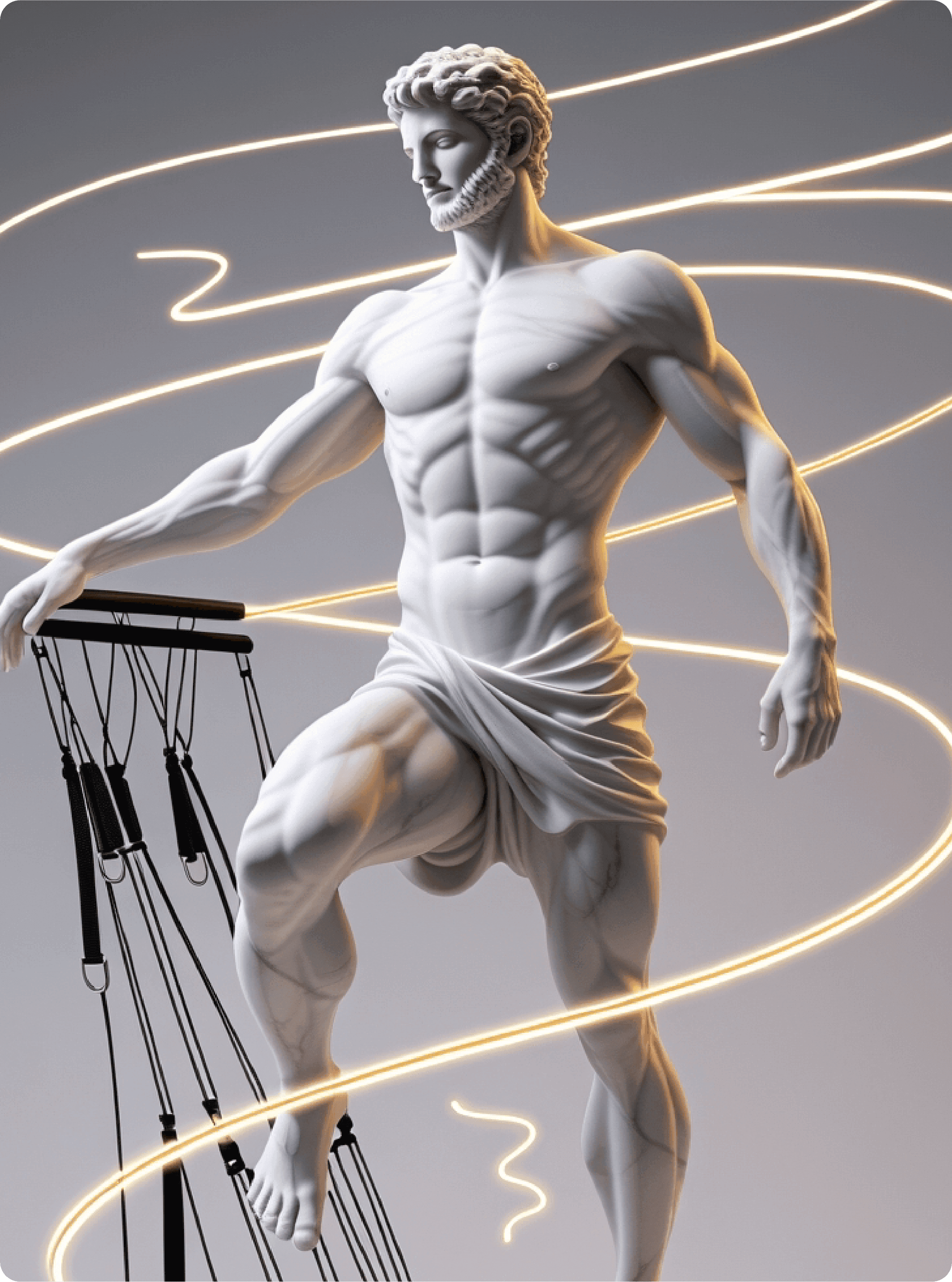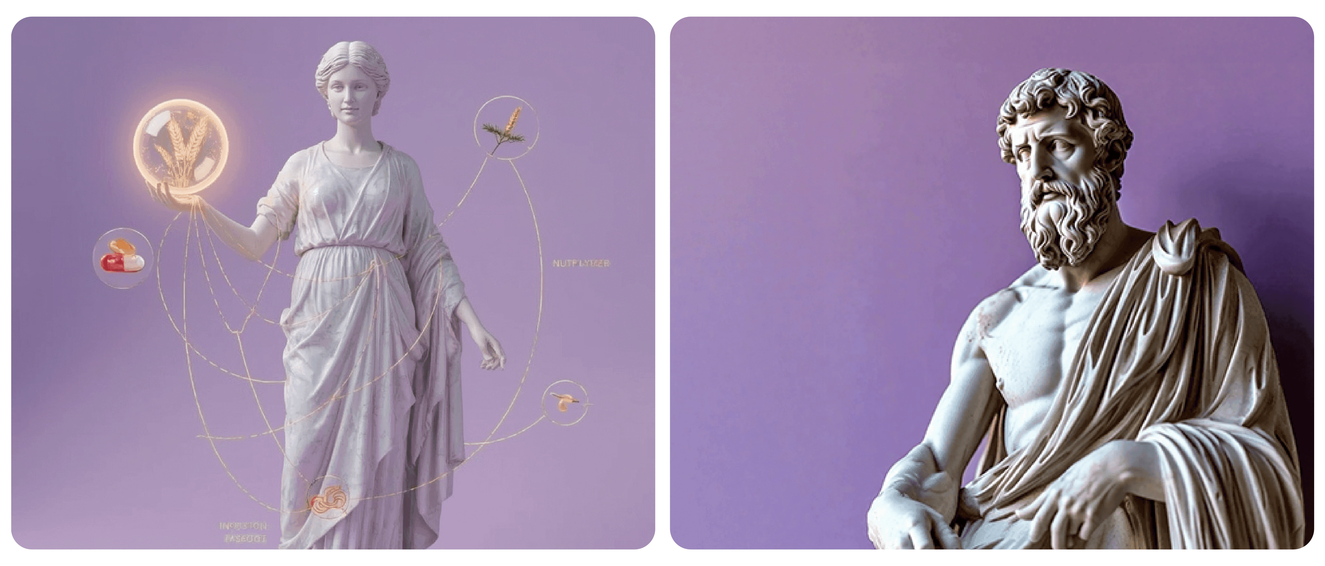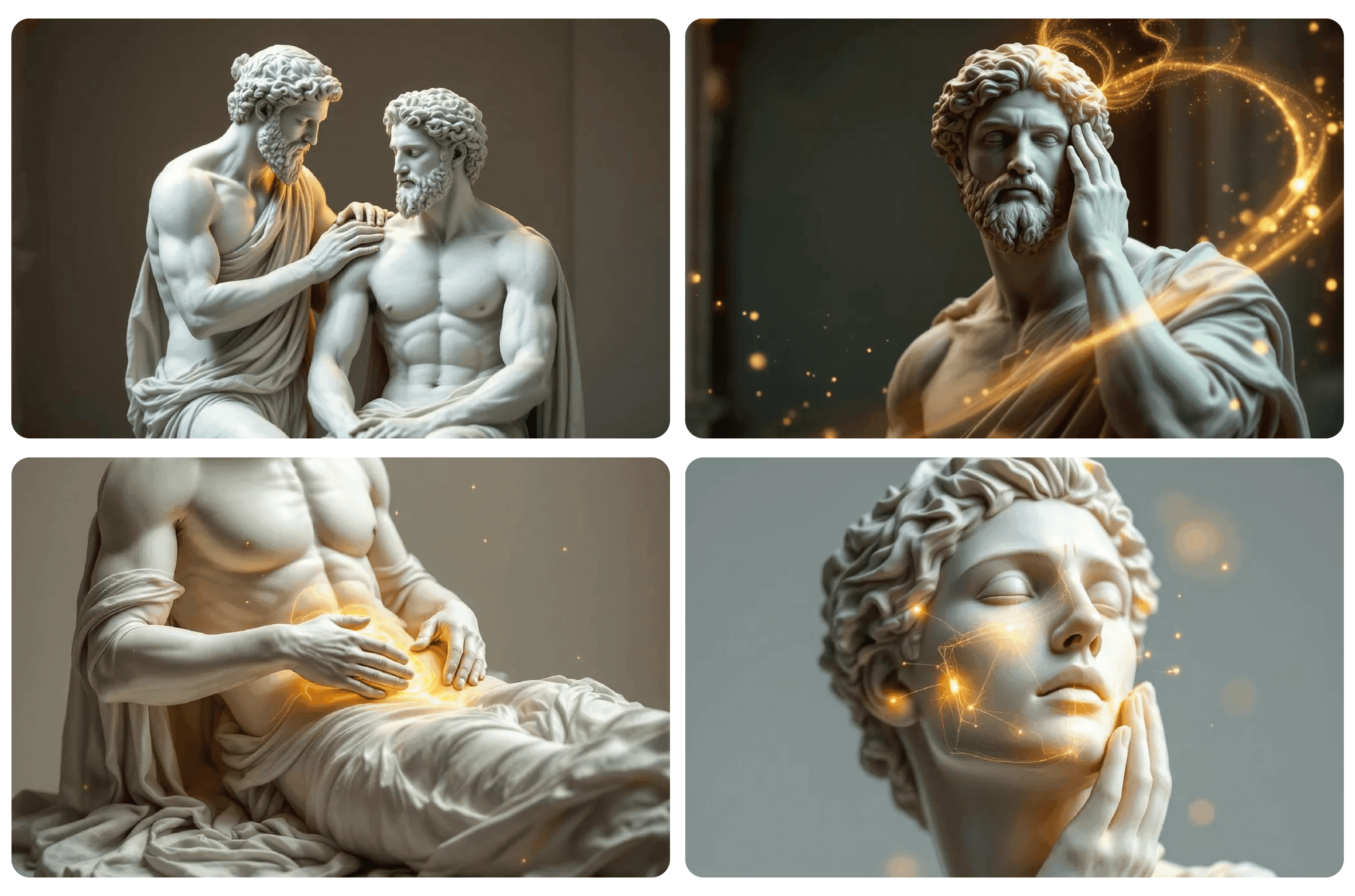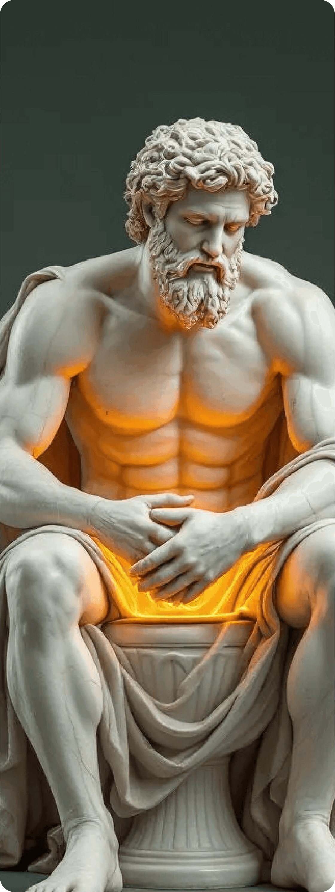 Classical sculptural imagery represents timeless wisdom, balance, and strength—reframed for a contemporary wellness narrative.