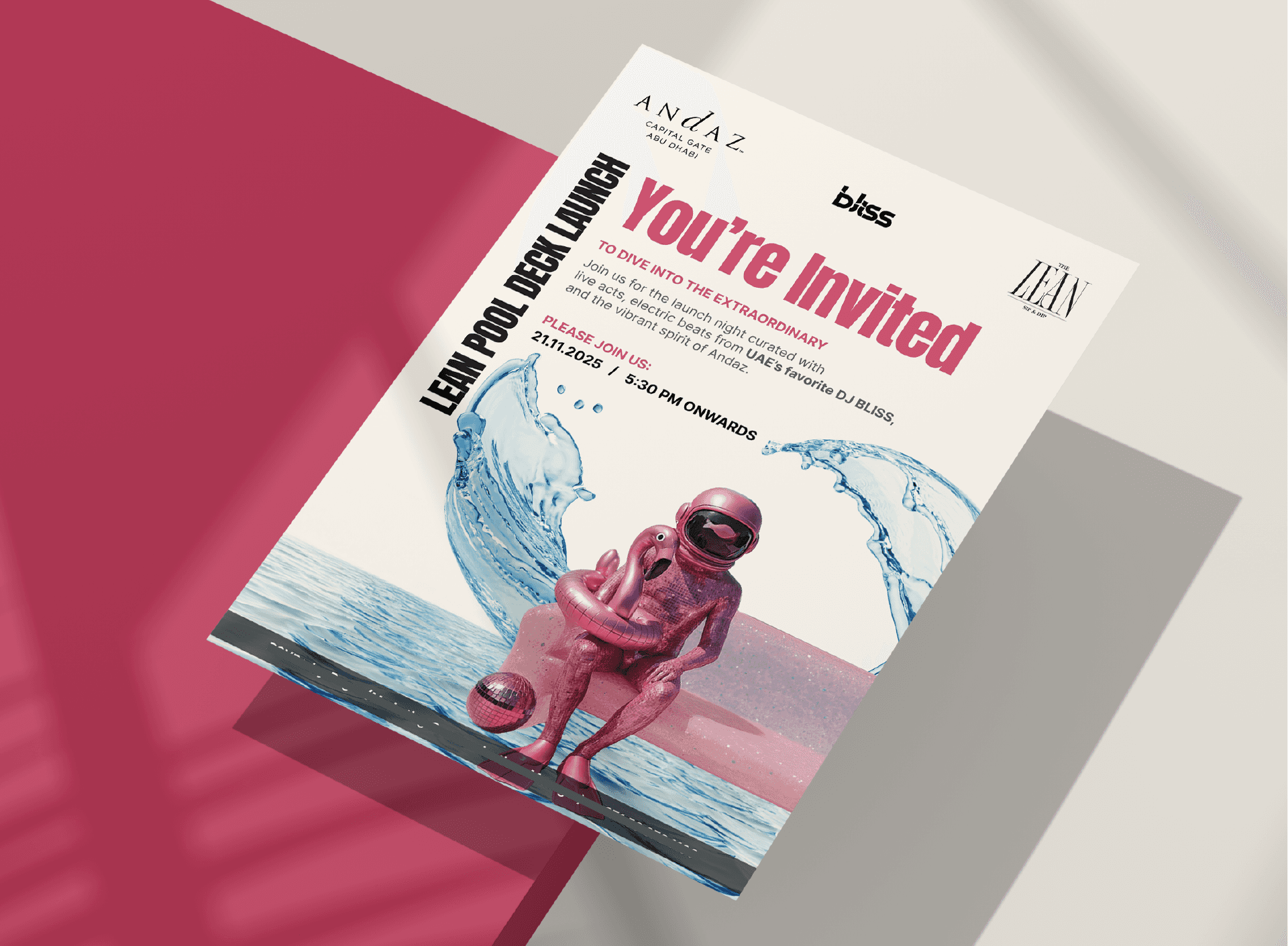 For The Lean pool launch at Andaz, we built a cohesive visual system — deep blues, fluid motion graphics, and refined typographic structure — that carried seamlessly across print and digital.